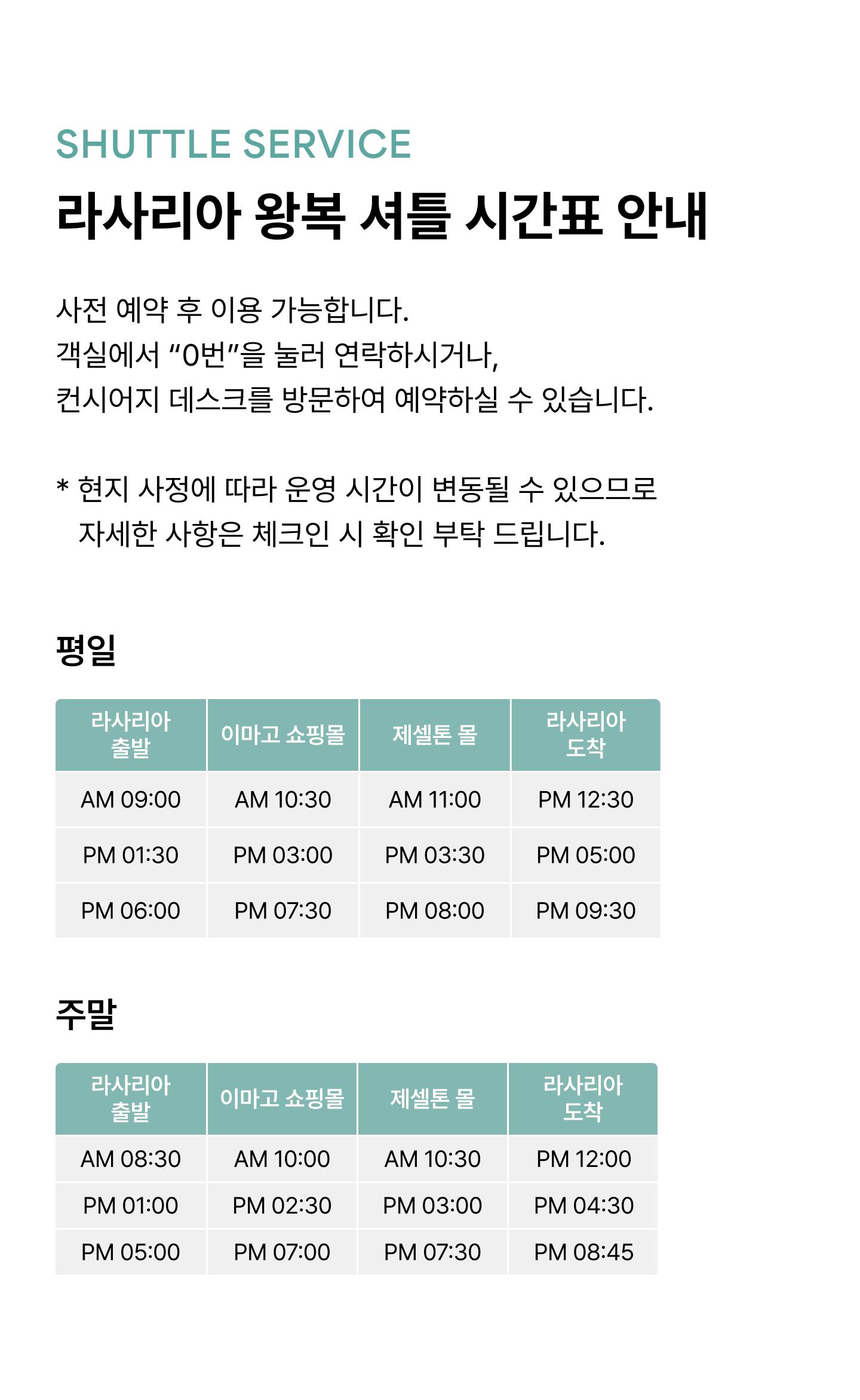 * 현지 사정에 따라 운영 시간이 변동될 수 있으므로 자세한 사항은 체크인 시 확인 부탁 드립니다.