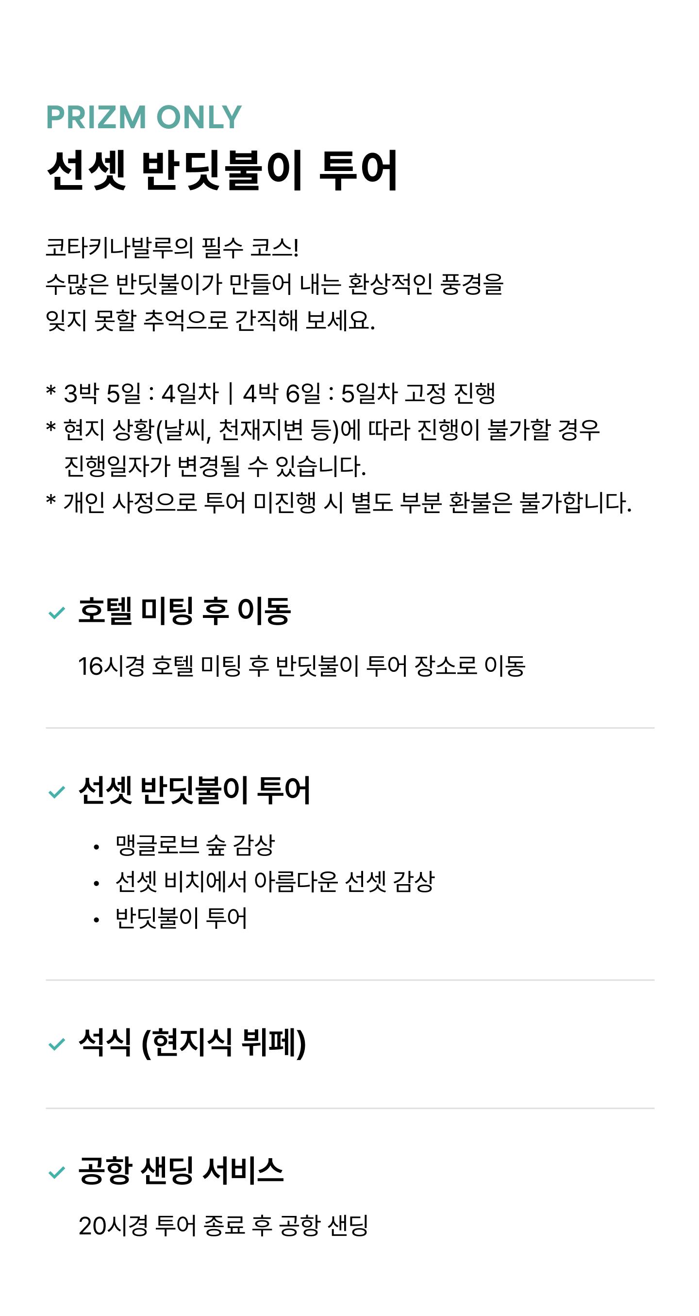 - 첫날 공항→호텔 / 마지막날 체크아웃 후 호텔→반딧불투어→공항