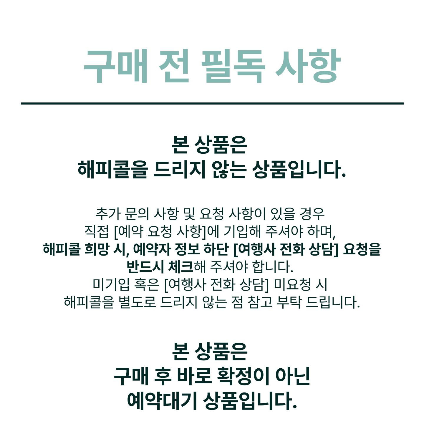 단, 판매기간 이더라도 해피콜이 진행된 경우 명확한 취소 진행을 위해 여행사로 취소접수 해주시기 바랍니다.