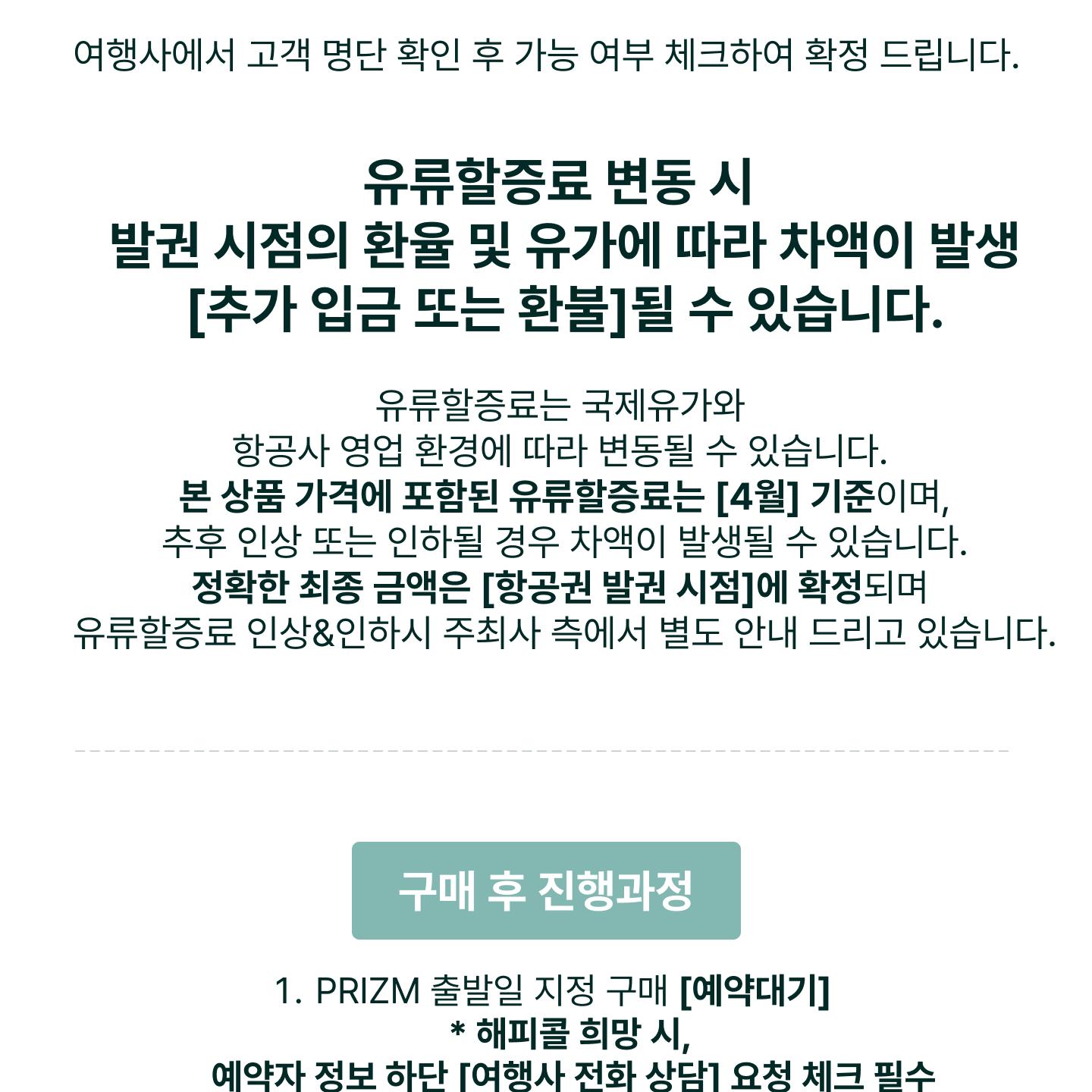 **발권 시점의 환율 및 유가에 따라 차액이 발생(추가 입금 또는 환불)**될 수 있습니다. 정확한 최종 금액은 항공권 발권 시점에 확정되며 유류할증료 인상&인하시 주최사 측에서 별도 안내드리고 있습니다.