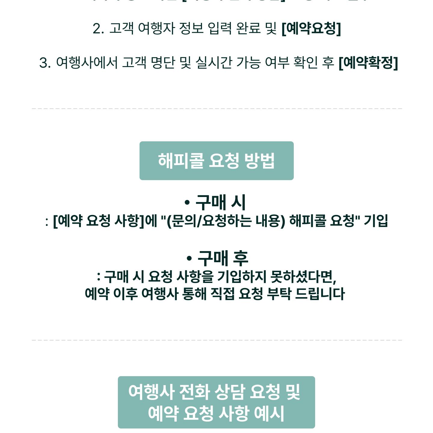 - 구매 시 : [예약 요청 사항]에 "그룹 지정 요청" 기입 주시면 해피콜 안내 드립니다.