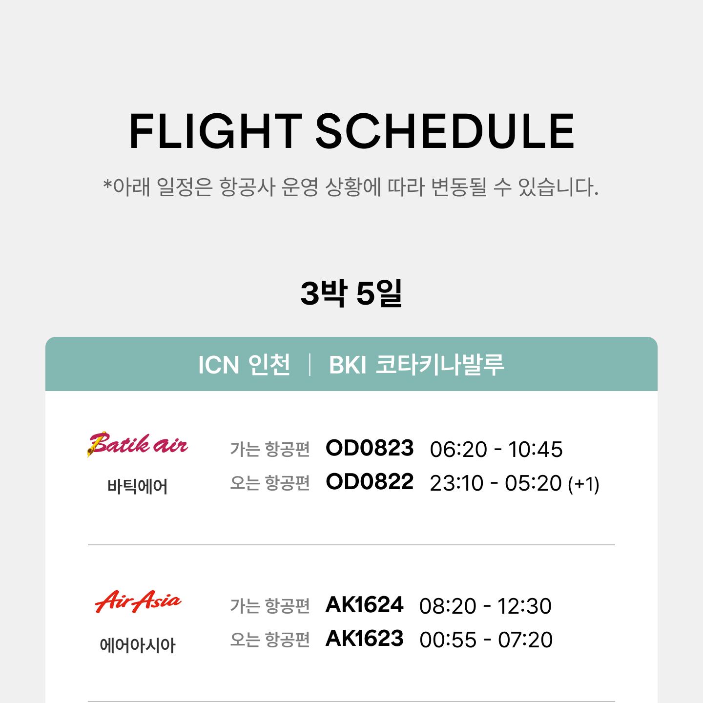 ※ 오전 출발 항공(에어아시아, 바틱에어)의 경우, 1일차 중식 불포함