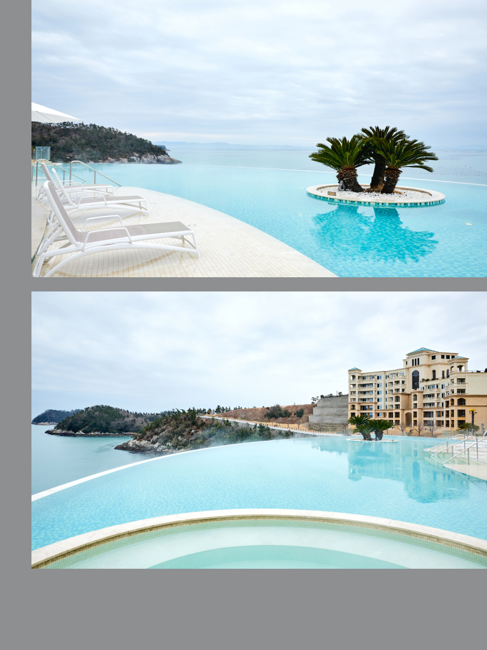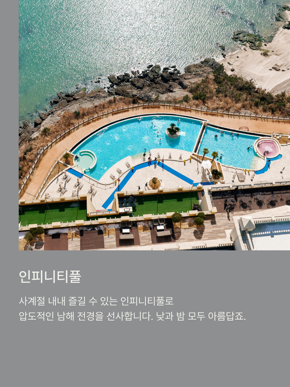 바다와 경계가 허물어진 인피니티 풀에서의 유영은