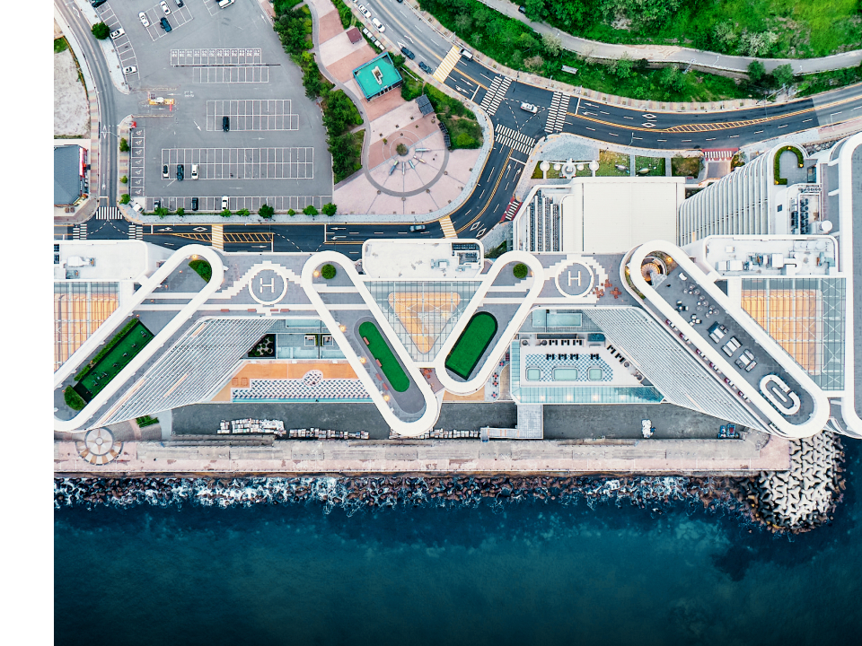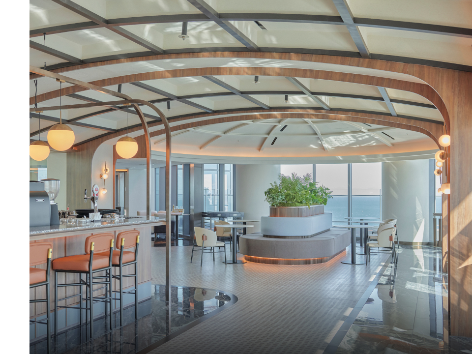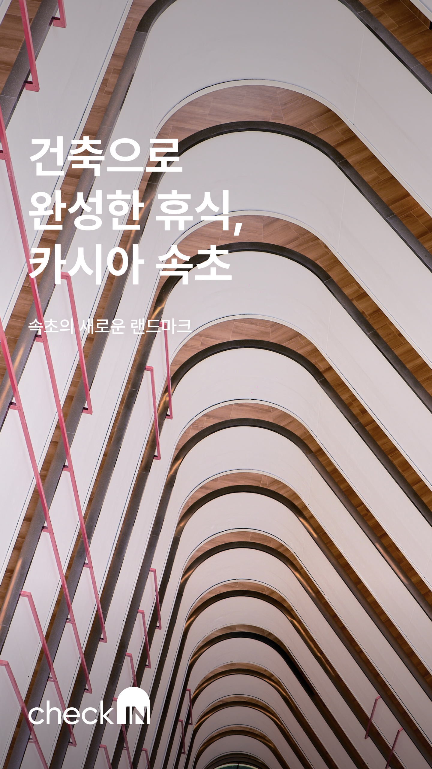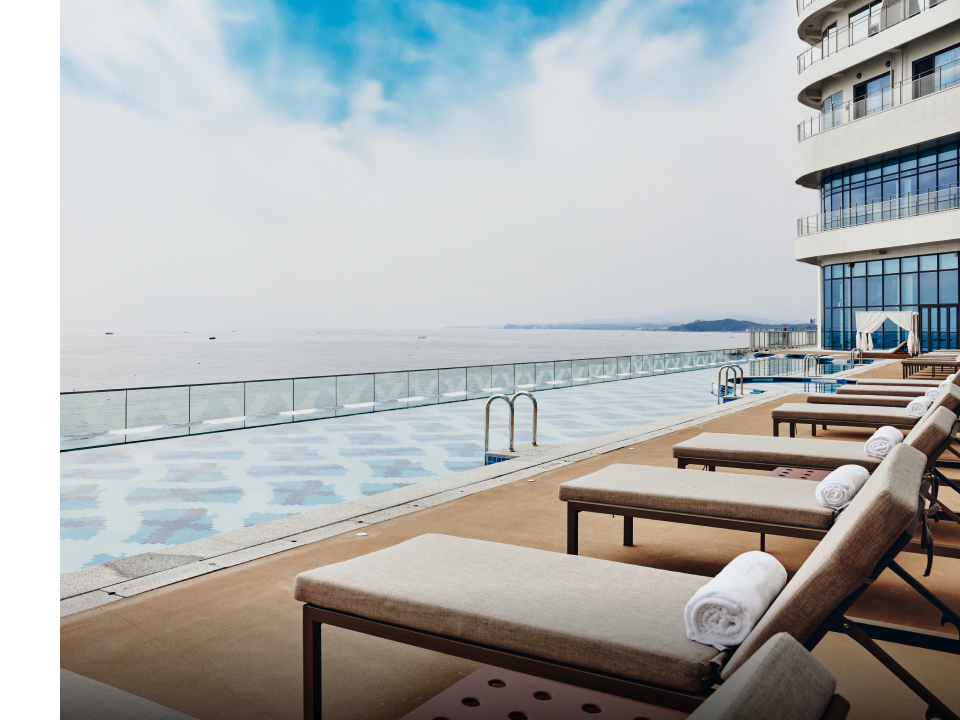 바다를 배경으로 건물의 외관을 무심히 응시하다가 속초로 떠나오기 전 미처 챙기지 못한 물건이 떠올랐다. 휴가에서 읽고 싶어서 사두었다가 집에 두고 온 책 3권. 건축가 김찬중은 휴가를 떠나서 가장 많이 하는 행동인 독서를 떠올리며 책을 모티브로 카시아 속초의 호텔을 설계했다. 펼쳐진 책 3권이 나란히 서 있는 모습을 형상화해 만든 건물은 대지 면적 12,022제곱미터에, 지하 2층부터 지상 26층 규모의 총 674개 객실로, 3개의 동으로 완성되었다. 이러한 구조는 전 객실이 바다를 조망할 수 있게 만든 핵심 포인트다. 실제로 수평선을 바라보며 독서의 황홀경에 빠져드는 경험을 즐길 수 있었다.