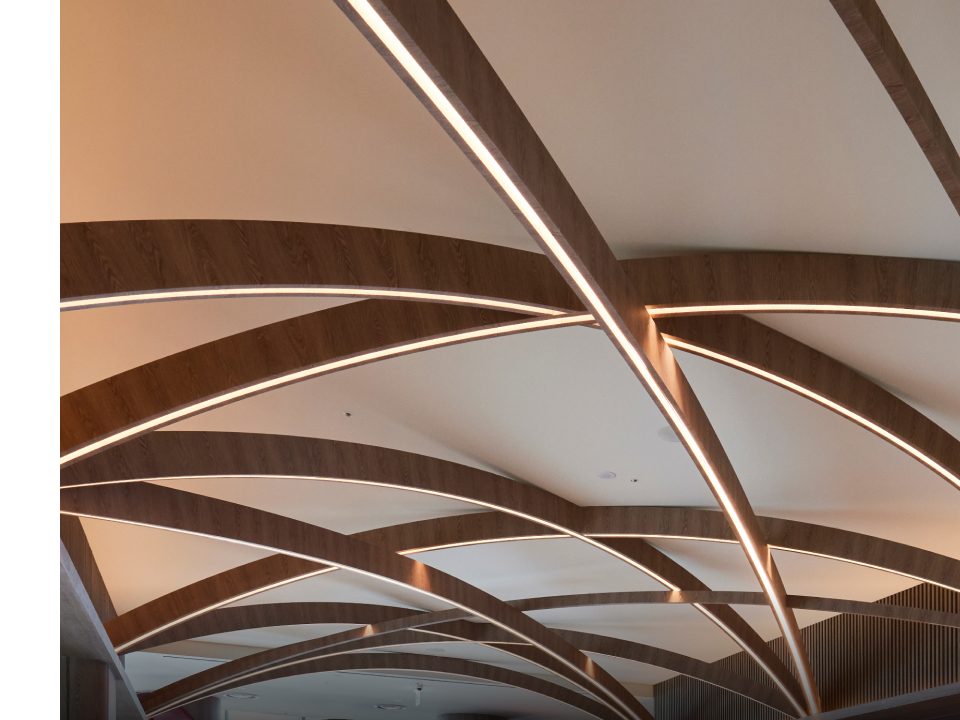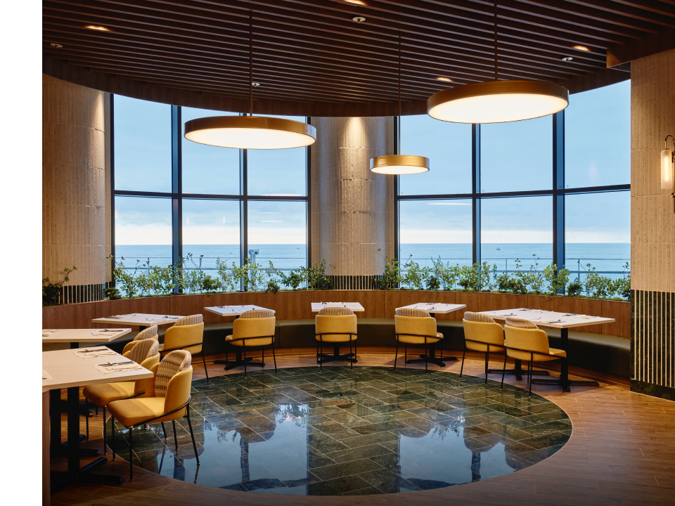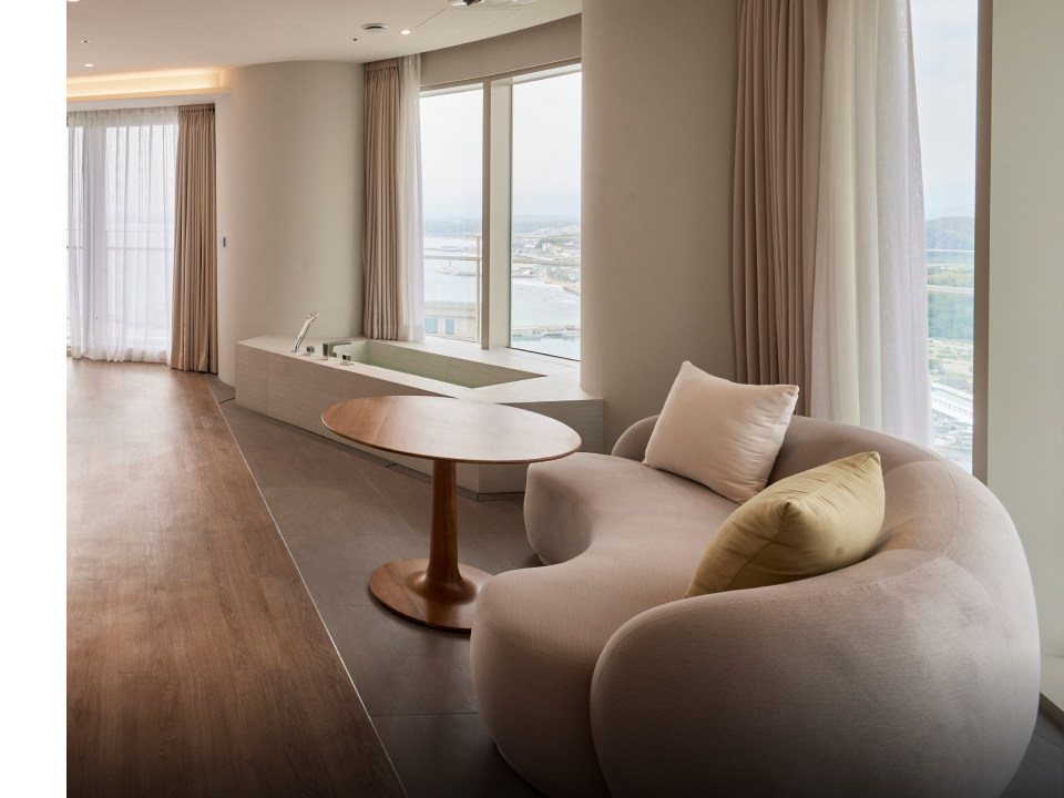 노래 ‘네모의 꿈'에서는 네모난 침대에서 일어나, 네모난 버스에 올라타고, 네모난 책상에서 시간을 보내는 모습을 설명하며 네모로 점철된 세상에서 둥글게 살아가자는 메시지를 전달한다. 건축가도 이런 의견에 동의했는지 속초에서의 휴식이 모나지 않도록 둥글고 또 둥글게 라운드 형태의 프레임을 호텔 곳곳에 적용했다. 둥근 기둥과 아치 형태의 구조물, 원형 테이블과 소파, 조명까지. 이러한 둥근 프레임의 반복을 통해 딱딱한 느낌을 지워 편안한 인상을 받을 수 있었다. 휴식을 방해하는 요소를 제거함으로써 온전한 쉼이 가능하도록 만들었다는 점을 고스란히 체감했다.