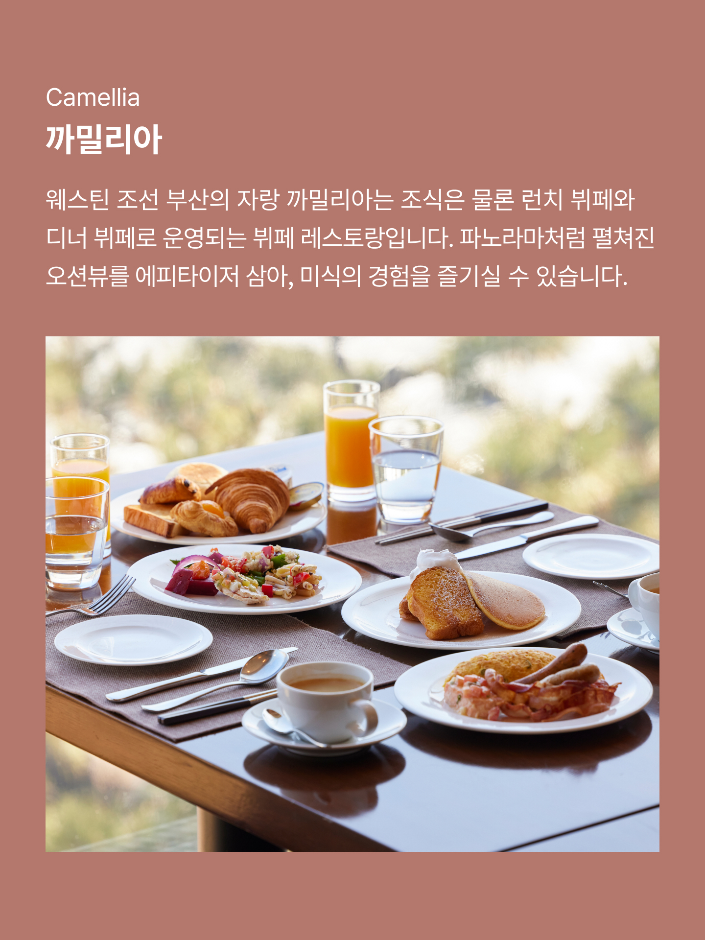평범한 하루도 여행의 한 장면이 되는 일. 특별한 한 끼로 일상에 행복을 더하는 것이 아닐까요. 웨스틴 조선 부산 안에 자리한 다채로운 다이닝 공간에서 맛있는 추억을 완성해 보세요.